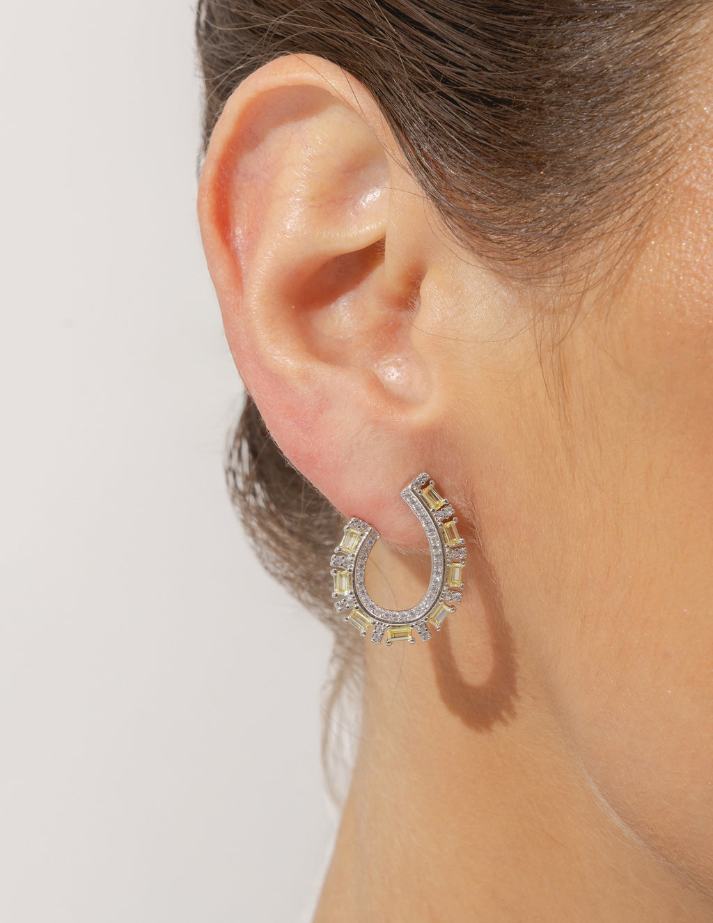 O Brinco Luísa apresenta um design moderno com pedras no formato baguete na cor citrino e micro zircônias cristais nas laterais.