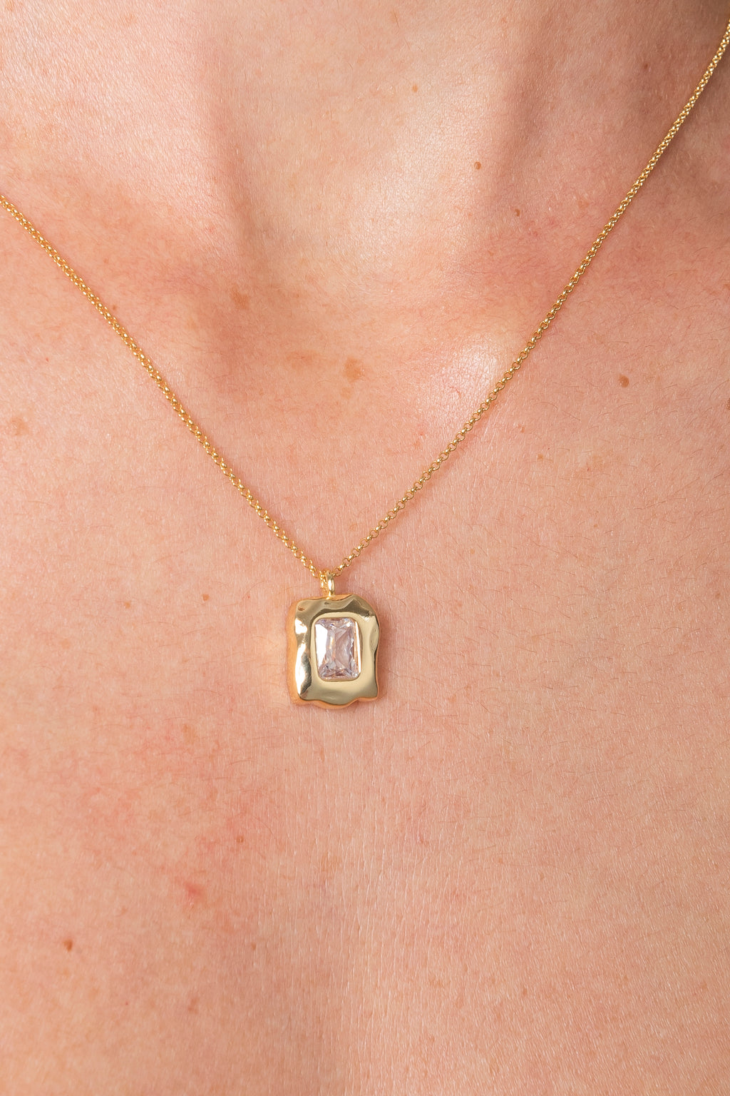"O Colar Made é delicado, clássico e atemporal. Seu design orgânico retangular é acentuado por uma pedra de zirconia no centro. Uma opção elegante e discreta.