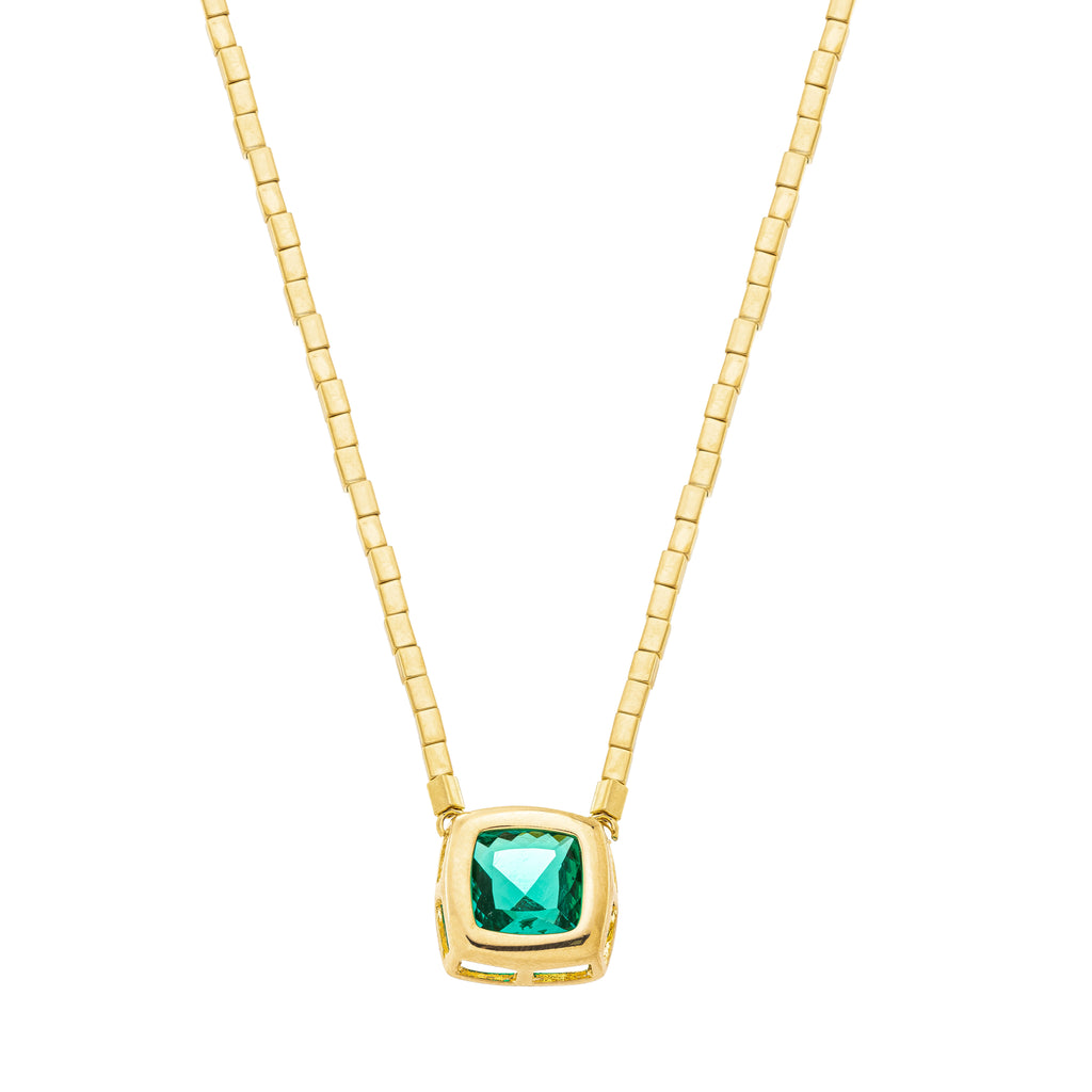 Com corrente de canutilhos delicada em banho de ouro e pingente geométrico cristal verde vibrante, essa peça é perfeita para iluminar o colo e adicionar sofisticação instantânea ao seu visual.