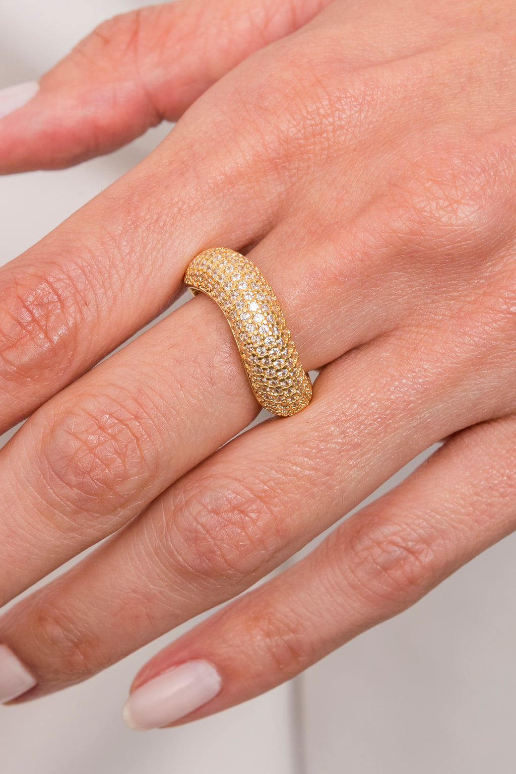 Este anel sofisticado apresenta um design exclusivo em forma ondulada, todo trabalhado em microzirconias. Sua beleza é complementada pela sua versatilidade, sendo ajustável e cabendo em qualquer numeração de dedo.